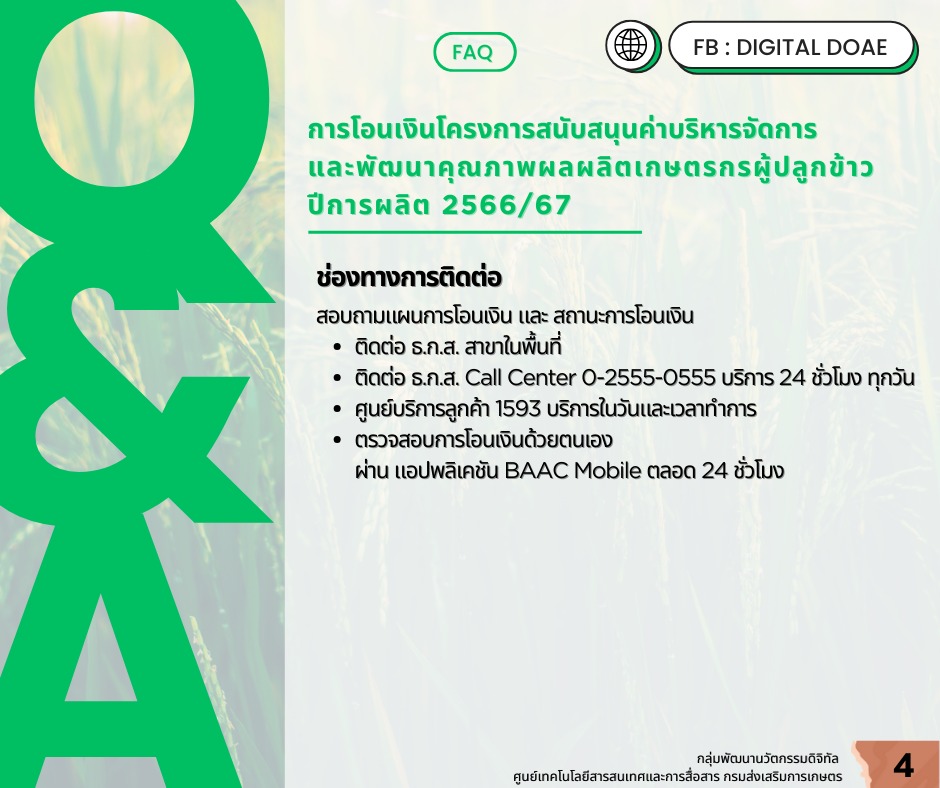5. ช่องทางการติดต่อสอบถามแผนการโอนเงินและสถานะการโอนเงิน ได้แก่ 1. ติดต่อ ธ.ก.ส. สาขาในพื้นที่ 2. ติดต่อ ธ.ก.ส. Call Center 0-2555-0555 บริการทุกวันตลอด 24 ชั่วโมง 3. ศูนย์บริการลูกค้า 1593 ในวันและเวลาทำการ 4. ตรวจสอบด้วยตนเองผ่าน BAAC Mobile ตลอด 24 ชั่วโมง