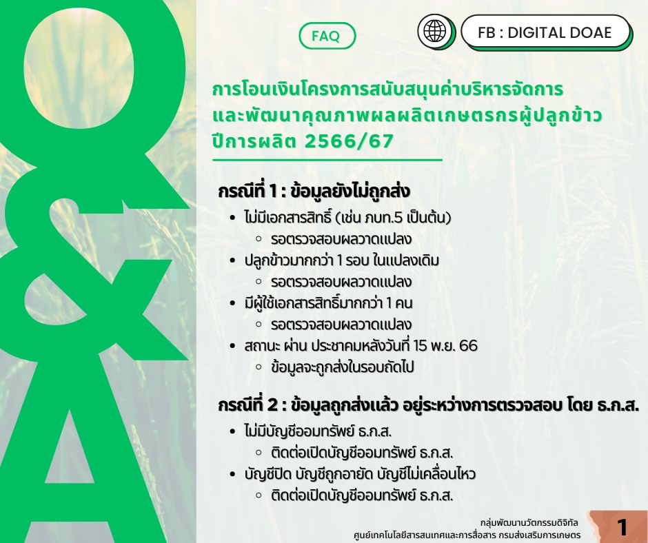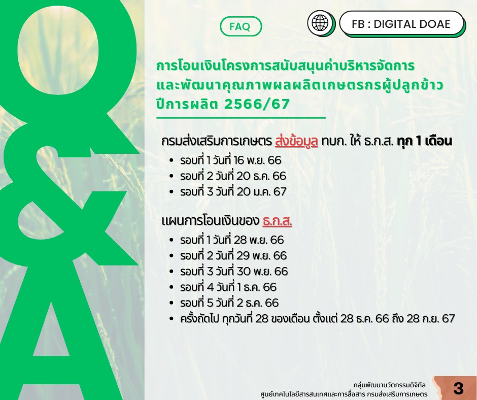 1. กรมส่งเสริมการเกษตรยังส่งข้อมูลให้ ธ.ก.ส. เพียงครั้งเดียวเมื่อวันที่ 16 พ.ย. 66 โดยกรมจะส่งข้อมูลให้ ธ.ก.ส. ทุก 1 เดือน คือวันที่ 16 พ.ย. 66, 20 ธ.ค. 66, 20 ม.ค. 67