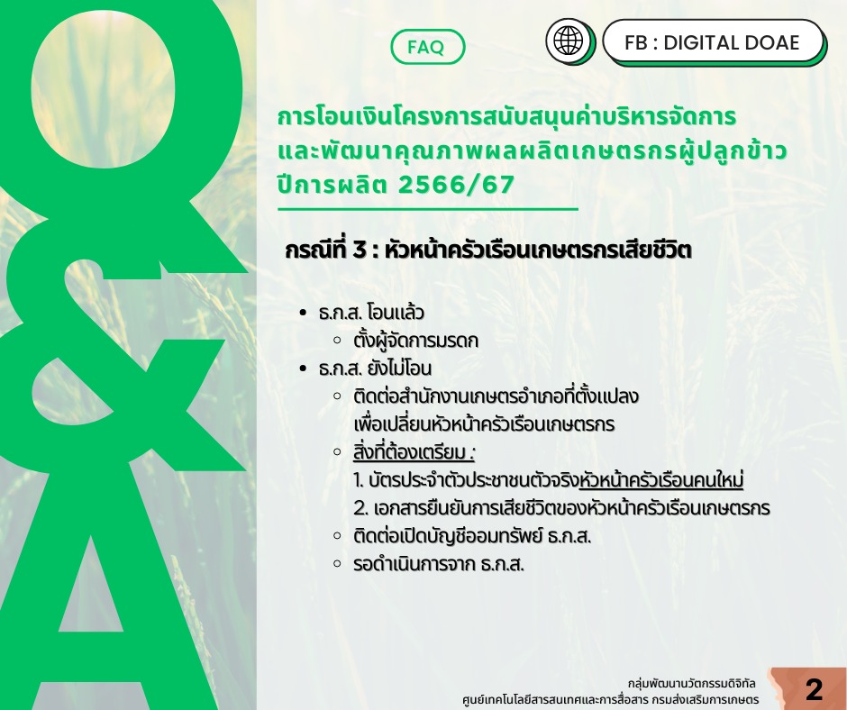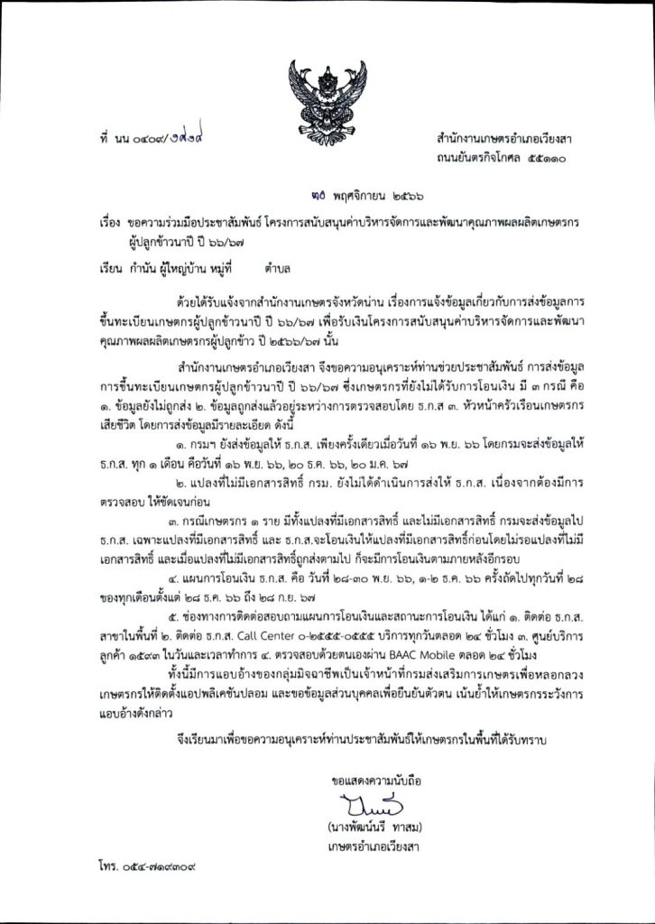 ประชาสัมพันธ์การส่งข้อมูลการขึ้นทะเบียนเกษตกรผู้ปลูกข้าวนาปี ปี 66/67 ซึ่งเกษตรกรที่ยังไม่ได้รับการโอนเงิน มี 3 กรณี คือ 1. ข้อมูลยังไม่ถูกส่ง 2. ข้อมูลถูกส่งแล้วอยู่ระหว่างการตรวจสอบโดย ธ.ก.ส 3. หัวหน้าครัวเรือนเกษตรกรเสียชีวิต โดยการส่งข้อมูลมีรายละเอียด ดังนี้