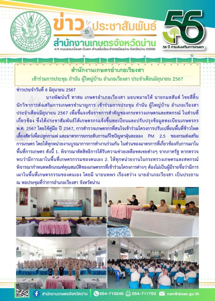 วันที่ 6 มิถุนายน 2567 นางพัฒน์นรี ทาสม เกษตรอำเภอเวียงสา มอบหมายให้ นายกมลสันต์ ไชยสีติ๊บ นักวิชาการส่งเสริมการเกษตรชำนาญการ เข้าร่วมการประชุม กำนัน ผู้ใหญ่บ้าน อำเภอเวียงสา ประจำเดือนมิถุนายน 2567 เพื่อชี้แจงข้อราชการสำคัญของกระทรวงเกษตรและสหกรณ์ ในส่วนที่เกี่ยวข้อง