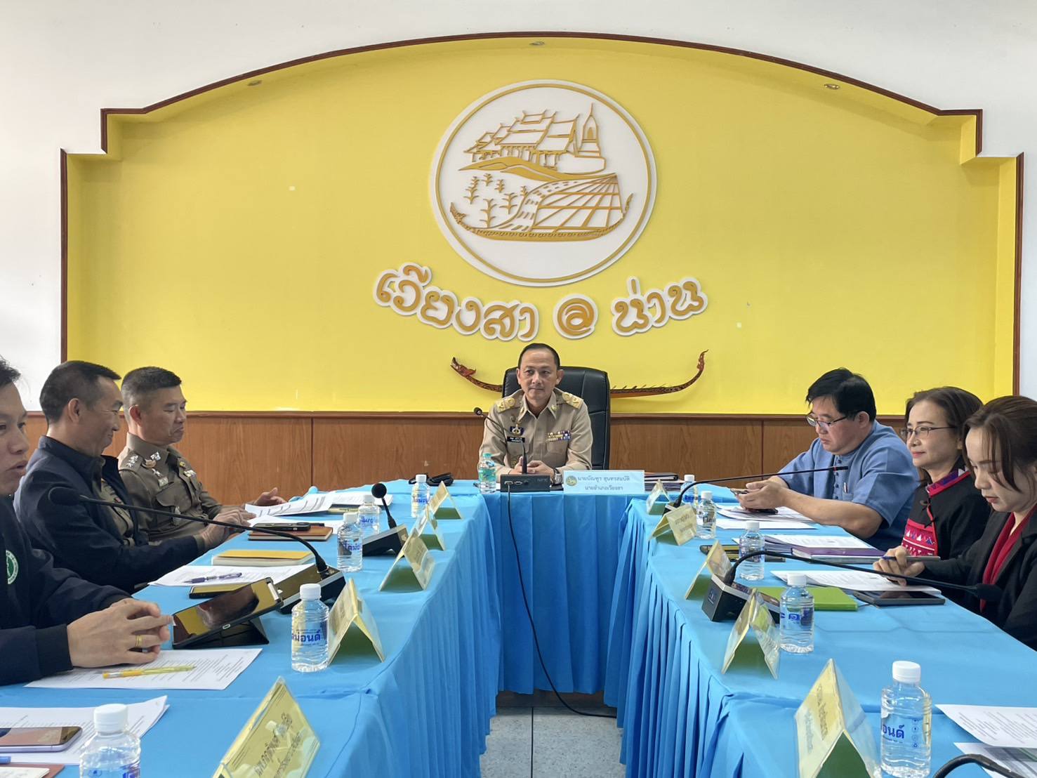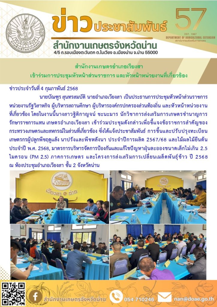 วันที่ 4 กุมภาพันธ์ 2568 นายบัณฑูร สุนทรสมบัติ นายอำเภอเวียงสา เป็นประธานการประชุมหัวหน้าส่วนราชการ หน่วยงานรัฐวิสาหกิจ ผู้บริหารสถานศึกษา ผู้บริหารองค์กรปกครองส่วนท้องถิ่น และหัวหน้าหน่วยงาน ที่เกี่ยวข้อง โดยในงานนี้นางสาวฐิติกาญจน์ ชะนะมาร นักวิชาการส่งเสริมการเกษตรชำนาญการ รักษาราชการแทน เกษตรอำเภอเวียงสา เข้าร่วมประชุมดังกล่าวเพื่อชี้แจงข้อราชการสำคัญของกระทรวงเกษตรและสหกรณ์ในส่วนที่เกี่ยวข้อง ซึ่งได้แจ้งประชาสัมพันธ์ การขึ้นและปรับปรุงทะเบียนเกษตรกรผู้ปลูกพืชฤดูแล้ง นาปรังและพืชหลังนา ประจำปีการผลิต 2567/68 และไม้ผลไม้ยืนต้นประจำปี พ.ศ. 2568, มาตรการบริหารจัดการป้องกันและแก้ไขปัญหาฝุ่นละอองขนาดเล็กไม่เกิน 2.5 ไมครอน (PM 2.5) ภาคการเกษตร และโครงการส่งเสริมการเปลี่ยนเมล็ดพันธุ์ข้าว ปี 2568 ณ ห้องประชุมอำเภอเวียงสา ชั้น 2 จังหวัดน่าน