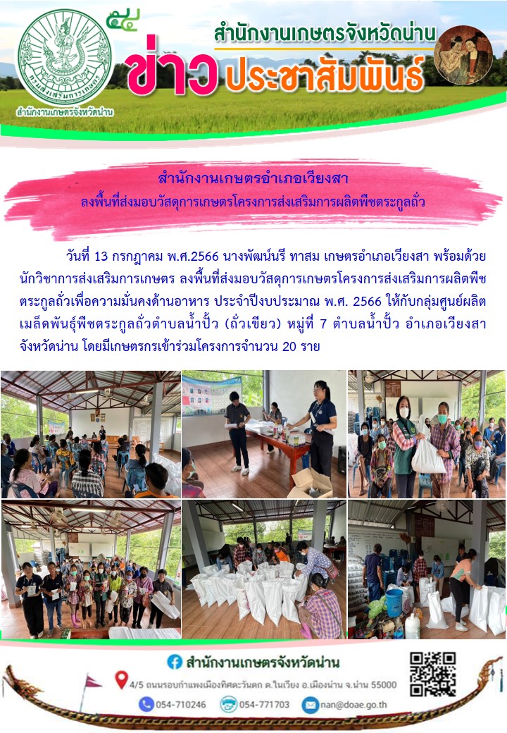 นางพัฒน์นรี ทาสม เกษตรอำเภอเวียงสา พร้อมด้วยนักวิชาการ ส่งเสริมการเกษตร ลงพื้นที่ส่งมอบวัสดุการเกษตรโครงการส่งเสริมการผลิตพืชตระกูลถั่วเพื่อความมั่นคงด้านอาหาร ประจำปีงบประมาณ พ.ศ. 2566 ให้กับกลุ่มศูนย์ผลิตเมล็ดพันธุ์พืชตระกูลถั่วตำบลน้ำปั้ว (ถั่วเขียว) หมู่ที่ 7 ตำบลน้ำปั้ว